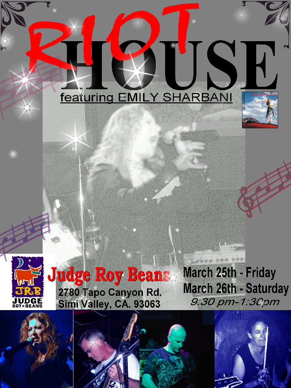 - 2/22/14 - WooHoo!!!! HOODWINK - Come to our inaugural gig... - 11/13 - After too long an absence, I have joined forces with a new original band, HOODWINK! Great musicians, great guys! We already have 11 new original songs! It feels great writing original music again! Can't wait to get in the recording studio. Look for upcoming gigs in February. I'll keep you posted!!! - 5/11/13 Saturday 3pm - 5pm - Singing with Sock Monkey at the Dixon May Fair in Dixon CA - Dixon Fairgrounds on 1st st. - 4/30/11 - RIOTHOUSE - High Energy Rock Cover Band - fronted by me!!!!) - Saturday night 9pm - 1am at Azar's Sports Bar & Steakhouse. 2215 Michael Dr. Newbury Park, CA (805) 498-2365 - 3/25/11 AND 3/26/11 - RIOTHOUSE - High Energy Rock Cover Band - fronted by me!!!!) - Friday AND Saturday night 9pm - 1am at JUDGE ROY BEANS 2780 Tapo Canyon Rd, Simi Valley, CA 93063 - 4/10/10 - LA RIOTHOUSE - High Energy Rock Cover Band - fronted by me!!!!) - Saturday night 9pm - 1am at Azar's Sports Bar & Steakhouse. 2215 Michael Dr. Newbury Park, CA (805) 498-2365 - 11/6/09 - LA RIOT HOUSE - High Energy Rock Cover Band - fronted by me!!!!) - 9pm - 1am at YANKEE DOODLES: 2830 Tapo Street, Simi Valley, Ca 93063 - (805)526-1130