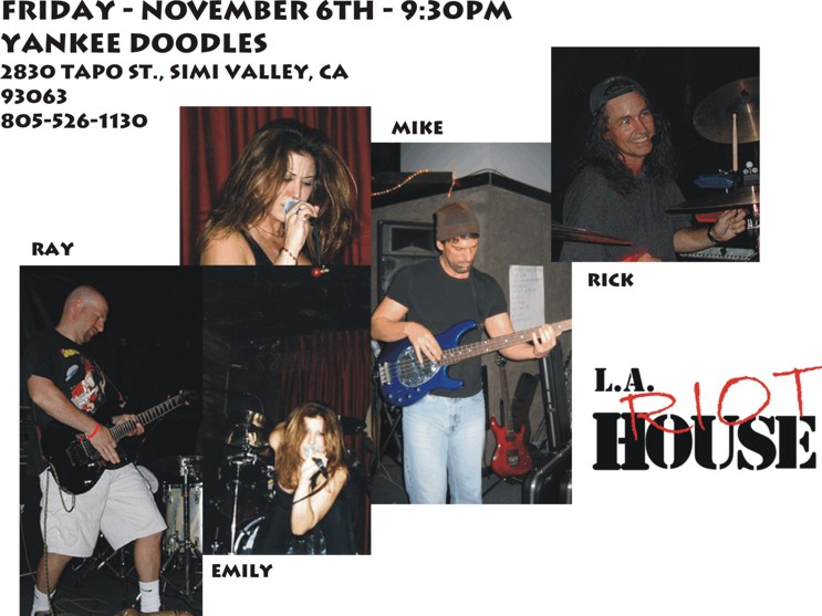 Emily is back on stage with her favorite band of all time --- LA RIOT HOUSE!!! High Energy rock/pop covers all night long. Everything from Led Zep and Heart to Nickleback and Papa Roach to Kelly Clarkson and No Doubt. Come down and have a blast with us! Woo Hoo... THE RETURN OF LA RIOT HOUSE !!! - 6/16/07 - BLACK